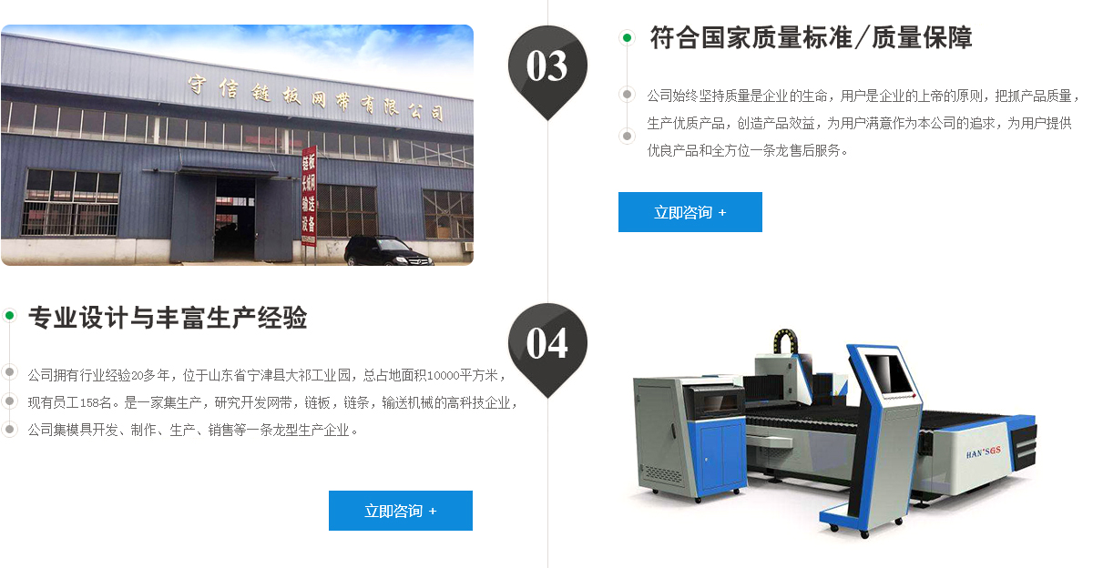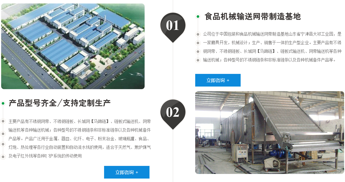 寧津縣守信鏈板網(wǎng)帶有限公司是中國包裝和食品機(jī)械輸送網(wǎng)帶制造基地,位于山東省寧津縣大祁工業(yè)園,是一家磨具開發(fā),機(jī)械設(shè)計(jì);生產(chǎn)、銷售于一體的生產(chǎn)型企業(yè)。主要產(chǎn)品有不銹鋼網(wǎng)帶、不銹鋼鏈板、長城網(wǎng)【馬蹄鏈】、鏈板式輸送機(jī)、網(wǎng)帶輸送機(jī)等各種輸送機(jī) 械;各種型號(hào)的不銹鋼鏈條和非標(biāo)準(zhǔn)鏈條以及各種機(jī)械備件產(chǎn)品等。產(chǎn)品廣泛用于金屬、器皿、化纖、電子、粉末冶金、玻璃瓶罐、食品、燈炮、熱處理等各行業(yè)自動(dòng)裝置和自動(dòng)流水線的使用,適合于天然氣、焦?fàn)t煤氣及電子紅外線等各種窯爐系統(tǒng)的傳動(dòng)使用,本廠始 終堅(jiān)持質(zhì)量是企業(yè)的生命,用戶是企業(yè)的上帝的原則,把抓產(chǎn)品質(zhì)量,生產(chǎn)優(yōu)質(zhì)產(chǎn)品,創(chuàng)造產(chǎn)品效益,為用戶滿意作為本公司的追求,為用戶提供優(yōu)良產(chǎn)品和全方位一條龍售后服務(wù)。...... 更多>>
